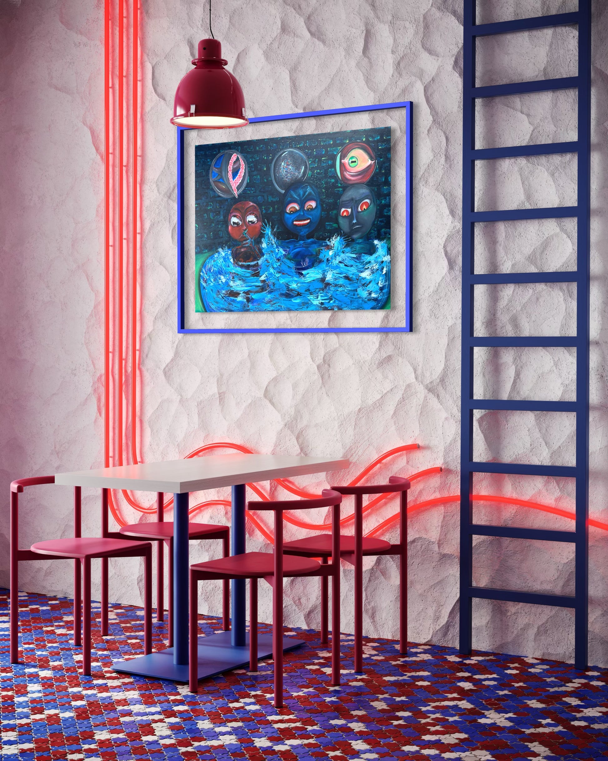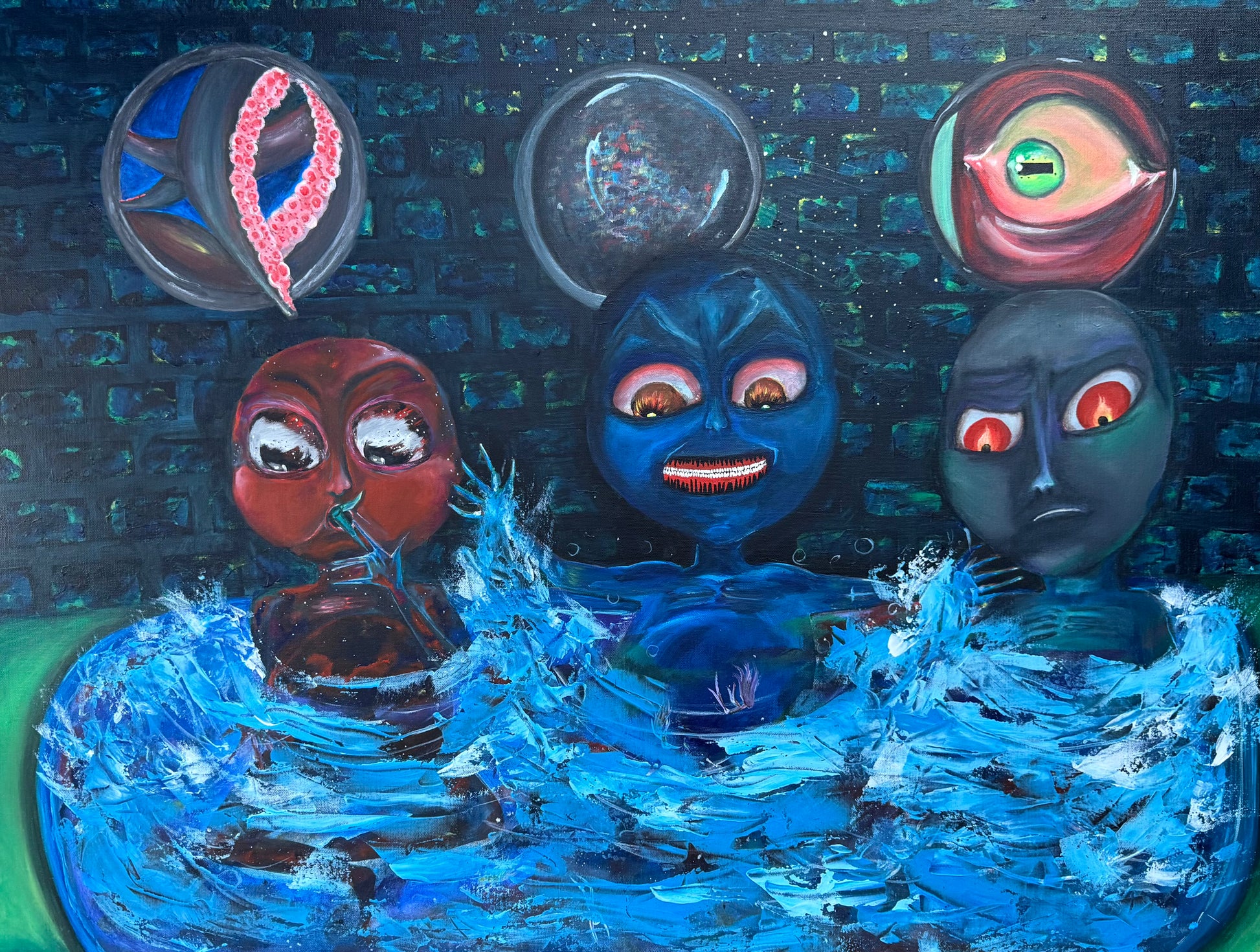 In the center, a larger figure dominates, its menacing bloodshot eyes and jagged teeth bared in an expression that could be rage…or perhaps laughter. With its outstretched arms spanning the pool’s edge, it embodies both danger and command.