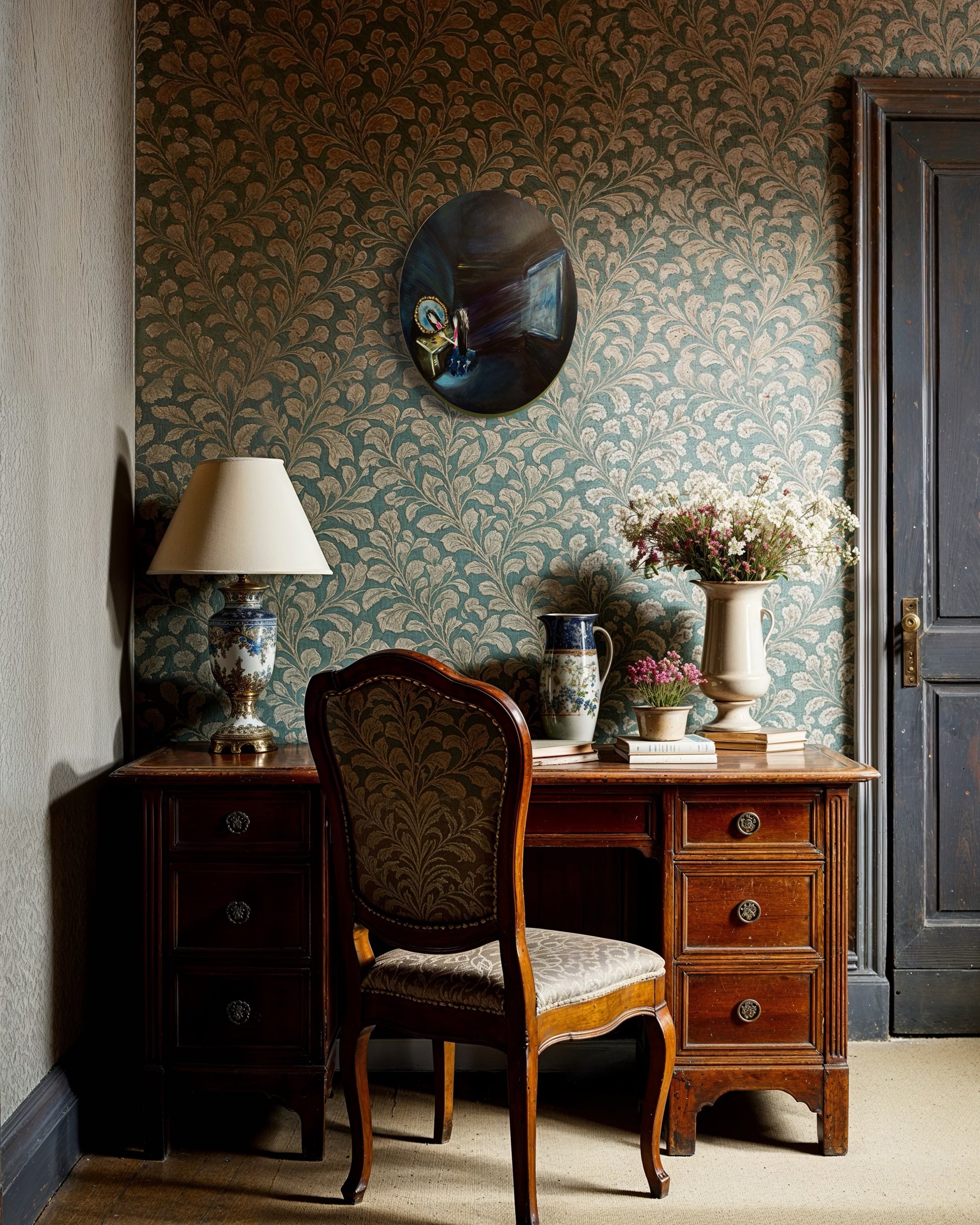 Shadows and color play a crucial role in building the mood. Deep blues and blacks provide a weighty, contemplative atmosphere, while the muted violets and rich browns suggest both fragility and groundedness. The hints of gold in the mirror’s trim shimmer with an otherworldly quality, balancing elegance with unease. Together, these colors weave a visual tension—beauty clashing with ambiguity, serenity disrupted by the unknown.