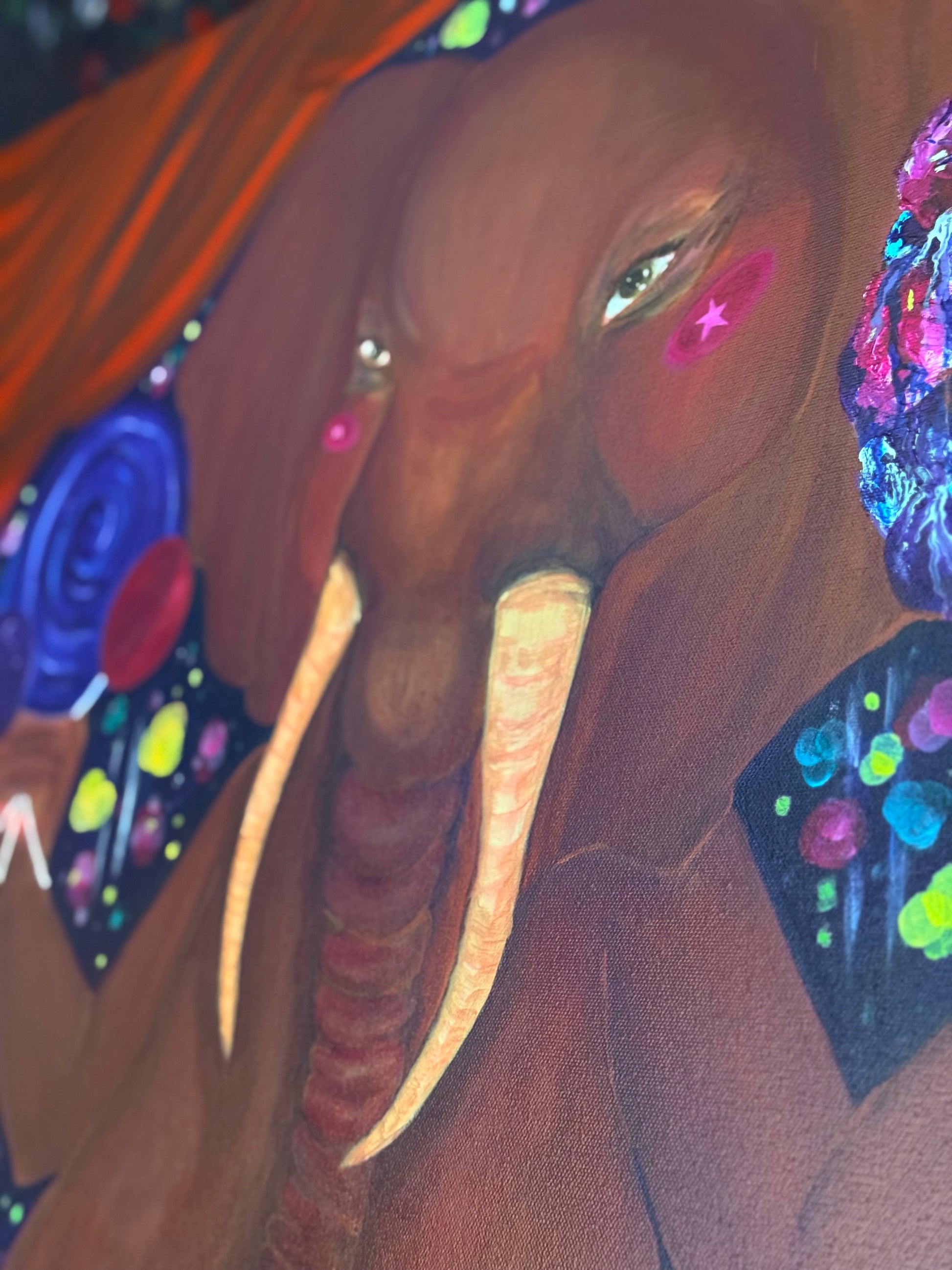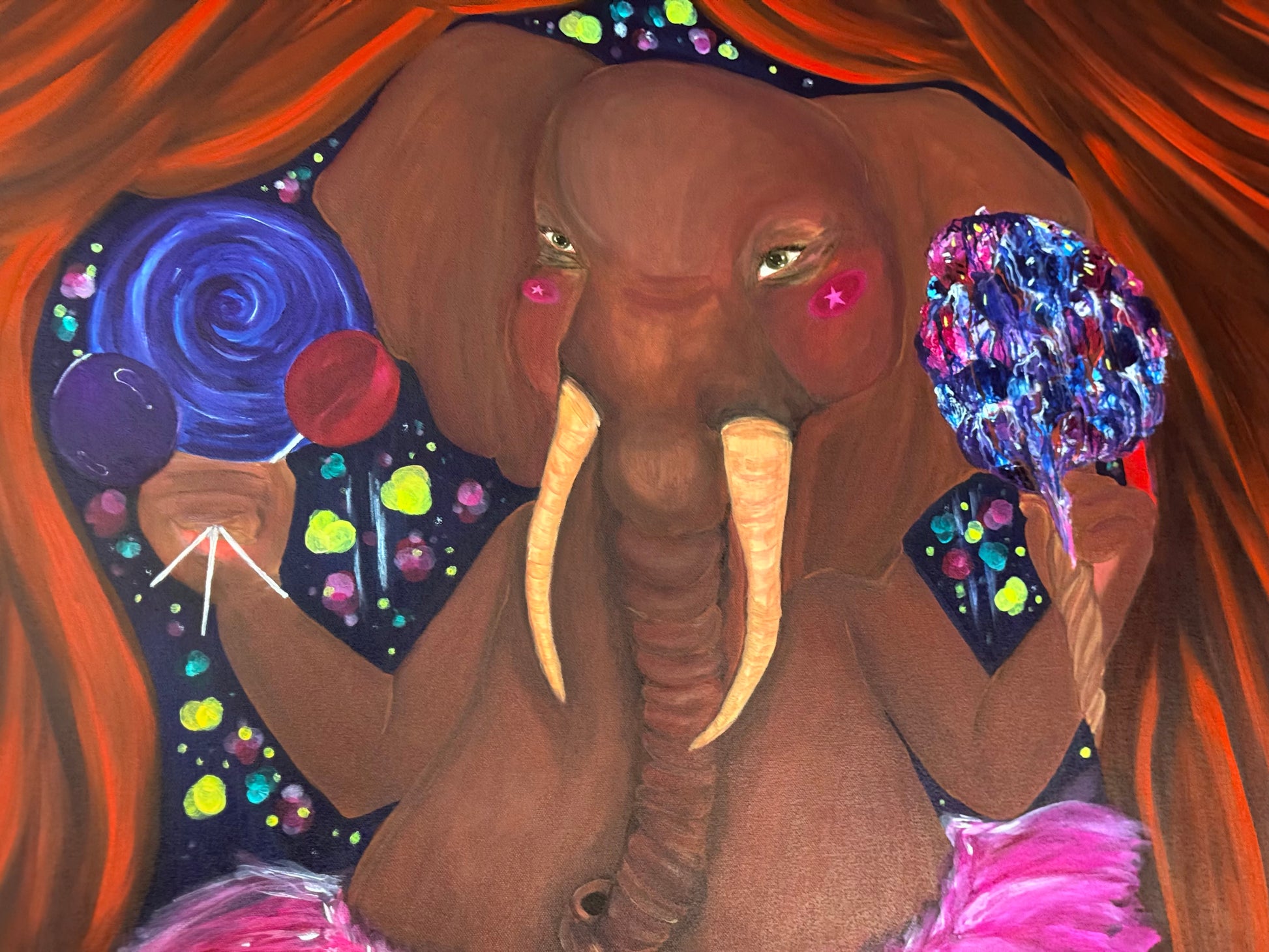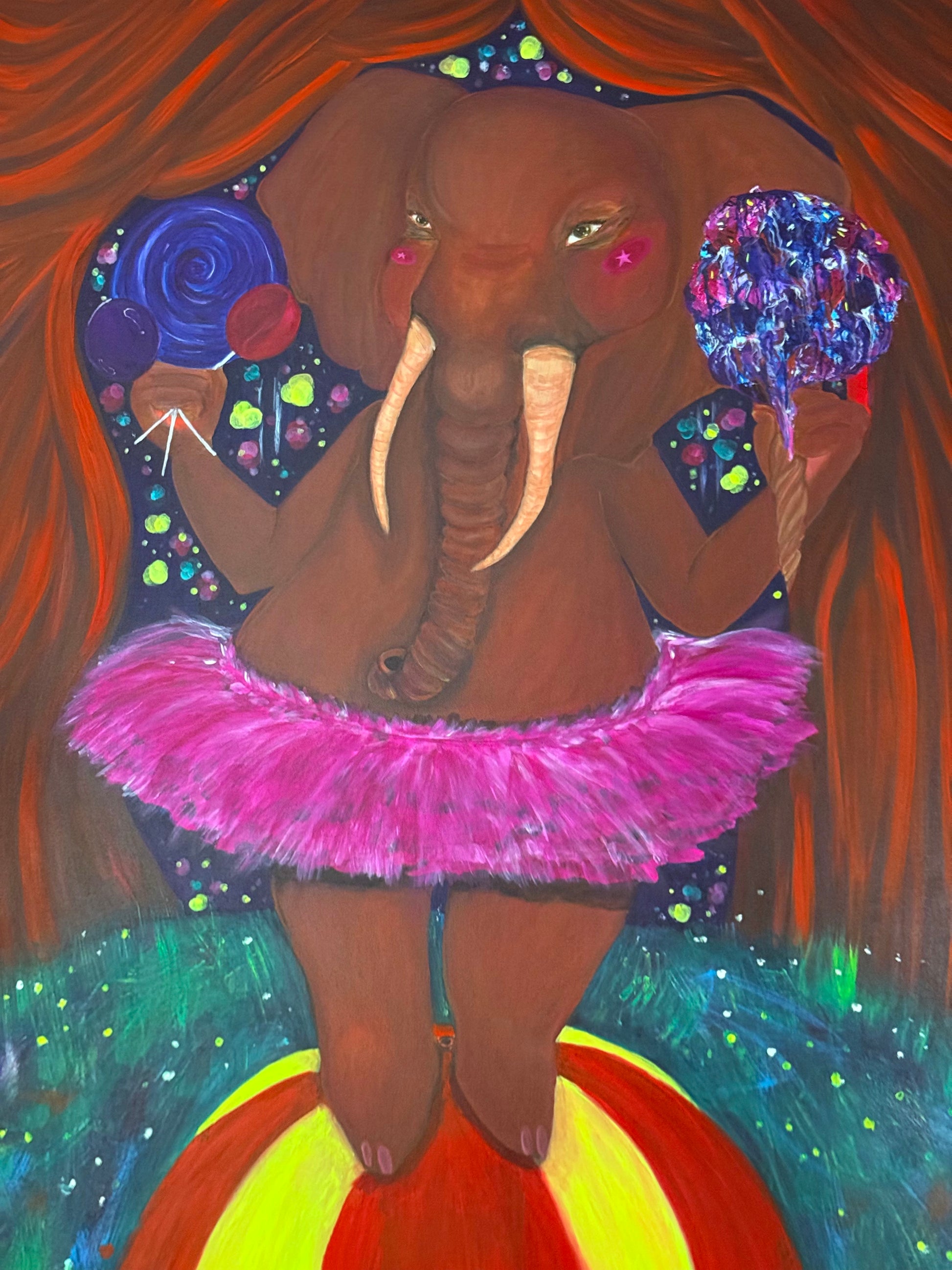 The painting features a beautifully anthropomorphic elephant balancing effortlessly on a ball, her body language poised yet gentle. Her skin shimmers with soft brown tones that blend seamlessly with the surrounding flora, while her tutu, rendered in glowing shades of pink and purple, adds a touch of playfulness and tenderness.