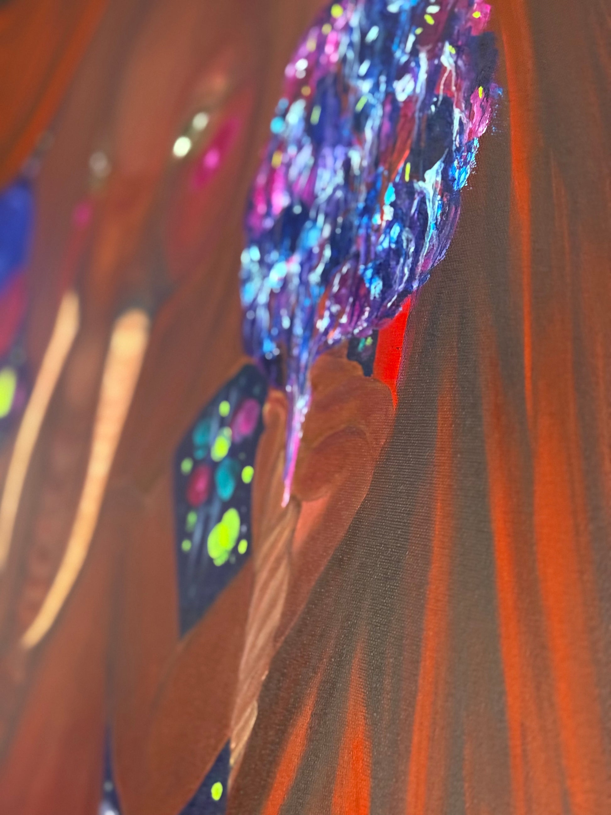 Whether displayed in a gallery, home, or private collection, The Waiting Performer serves as a conversation piece that radiates emotion, color, and presence. Every inch of the 36"x48" surface tells a story, from the smallest flower to the gleam in her expressive eyes.